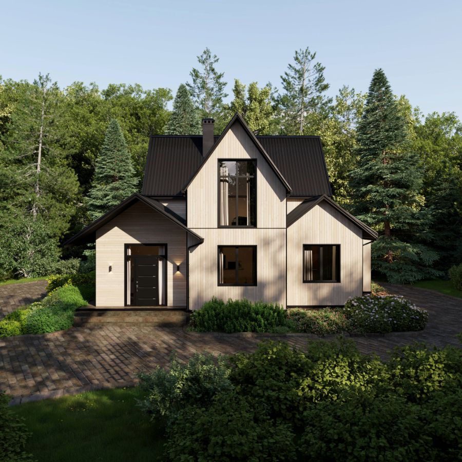 Residential exterior render with Maibec's genuine red cedar wood siding.